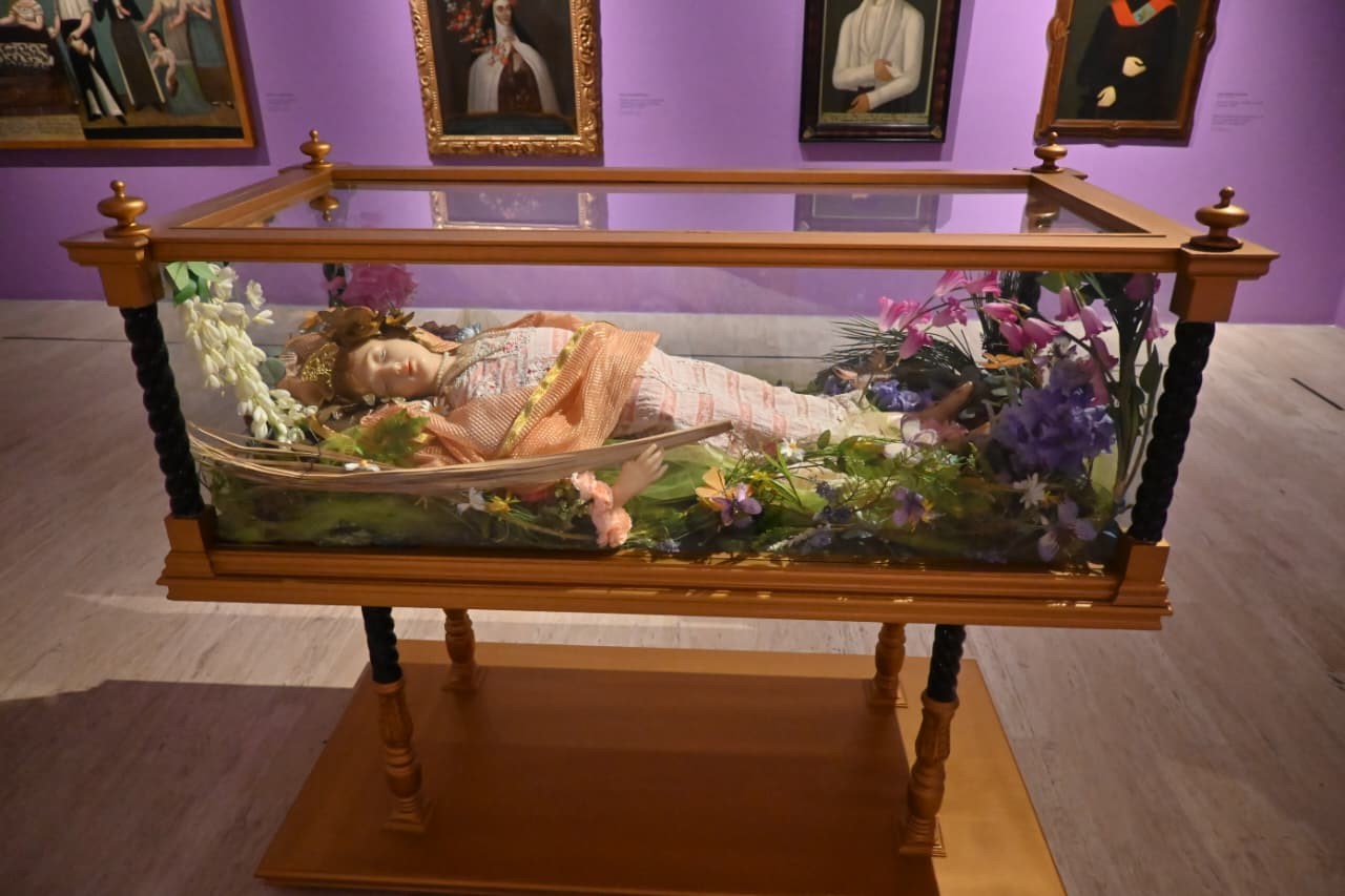 Entre las piezas se incluyen títeres de la compañía Rosete Aranda, grabados de José Guadalupe Posada y figuras de cera, como El cuerpo relicario de Santa Rosita (siglo XIX), perteneciente al Museo Casa de las Mil Muñecas de la Ciudad de México. La exposición se complementa con un núcleo dedicado a la muerte infantil, integrado por esculturas de infantes dormidos de gran detalle.