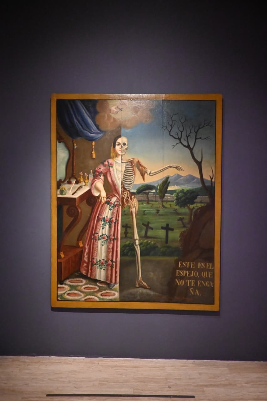 La muestra abre con la pintura de gran formato Episodio del diluvio universal, realizada en 1851 por Francesco Goghetti, pintor italiano de gran renombre en el siglo XIX. La obra presenta una escena dramática del diluvio universal, en la que las personas intentan salvarse del castigo. Se exhiben también pinturas como Este es el espejo que no te engaña (1856), de Tomás Mondragón, donde se observa a una mujer de tamaño natural: una mitad ataviada con lujo y la otra convertida en esqueleto. Destaca además Cuerpo putrefacto (siglo XVIII), de autor desconocido, una representación de un cadáver en descomposición utilizada por la Iglesia como recordatorio moral.