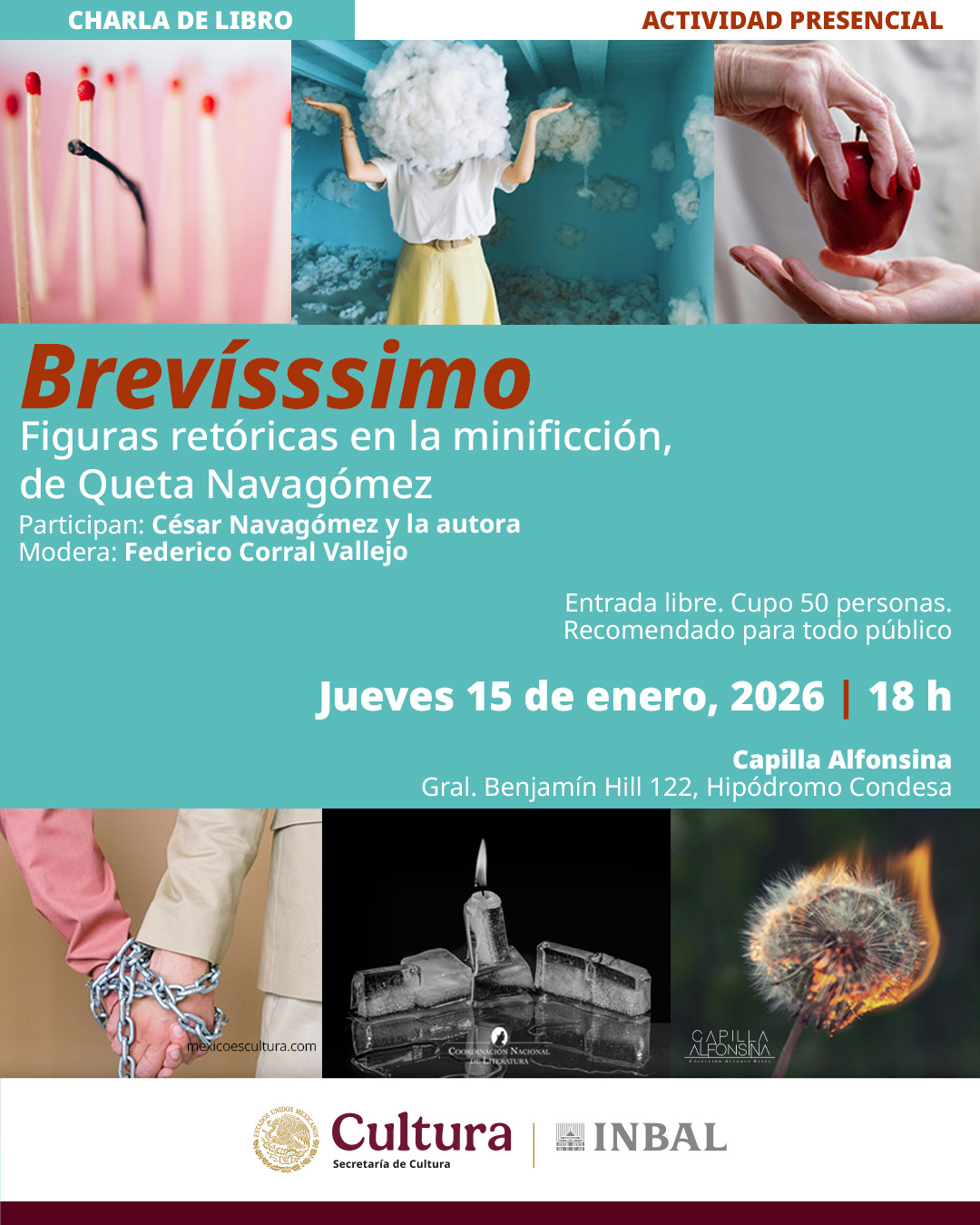 La presentación se llevará a cabo el jueves 15 de enero a las 18 horas, en la Capilla Alfonsina, ubicada en General Benjamín Hill núm. 122, colonia Hipódromo Condesa, alcaldía Cuauhtémoc. Entrada libre, cupo limitado a 50 personas.