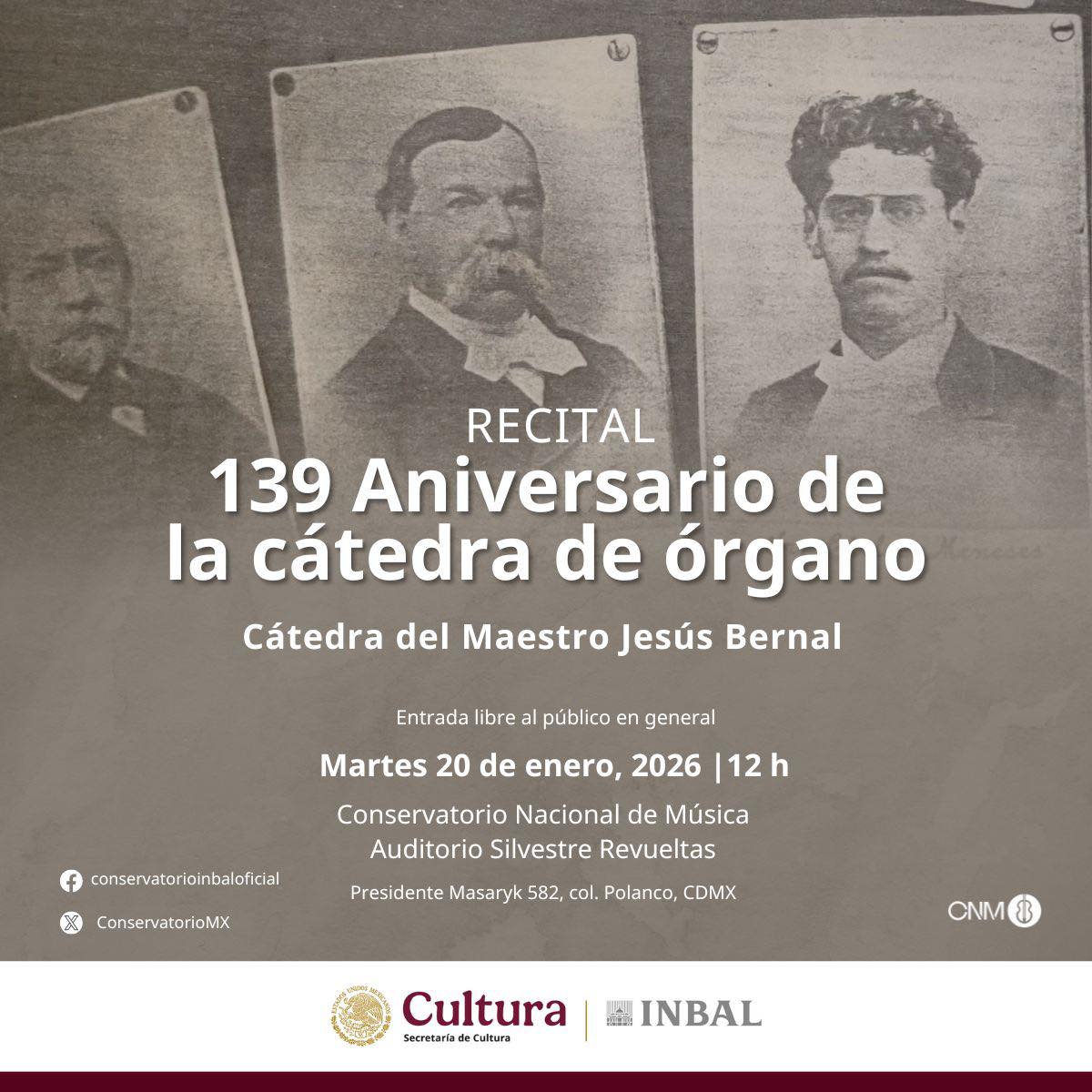 El Conservatorio Nacional de Música (CNM), adscrito a la Subdirección General de Educación e Investigación Artísticas (SGEIA) del Instituto Nacional de Bellas Artes y Literatura (INBAL), celebrará el 139 aniversario de la Cátedra de Órgano con un recital a cargo de estudiantes del maestro Jesús Bernal, el 20 de enero, a las 12 horas, en el Auditorio Silvestre Revueltas de esta institución educativa. La entrada es libre para el público en general.