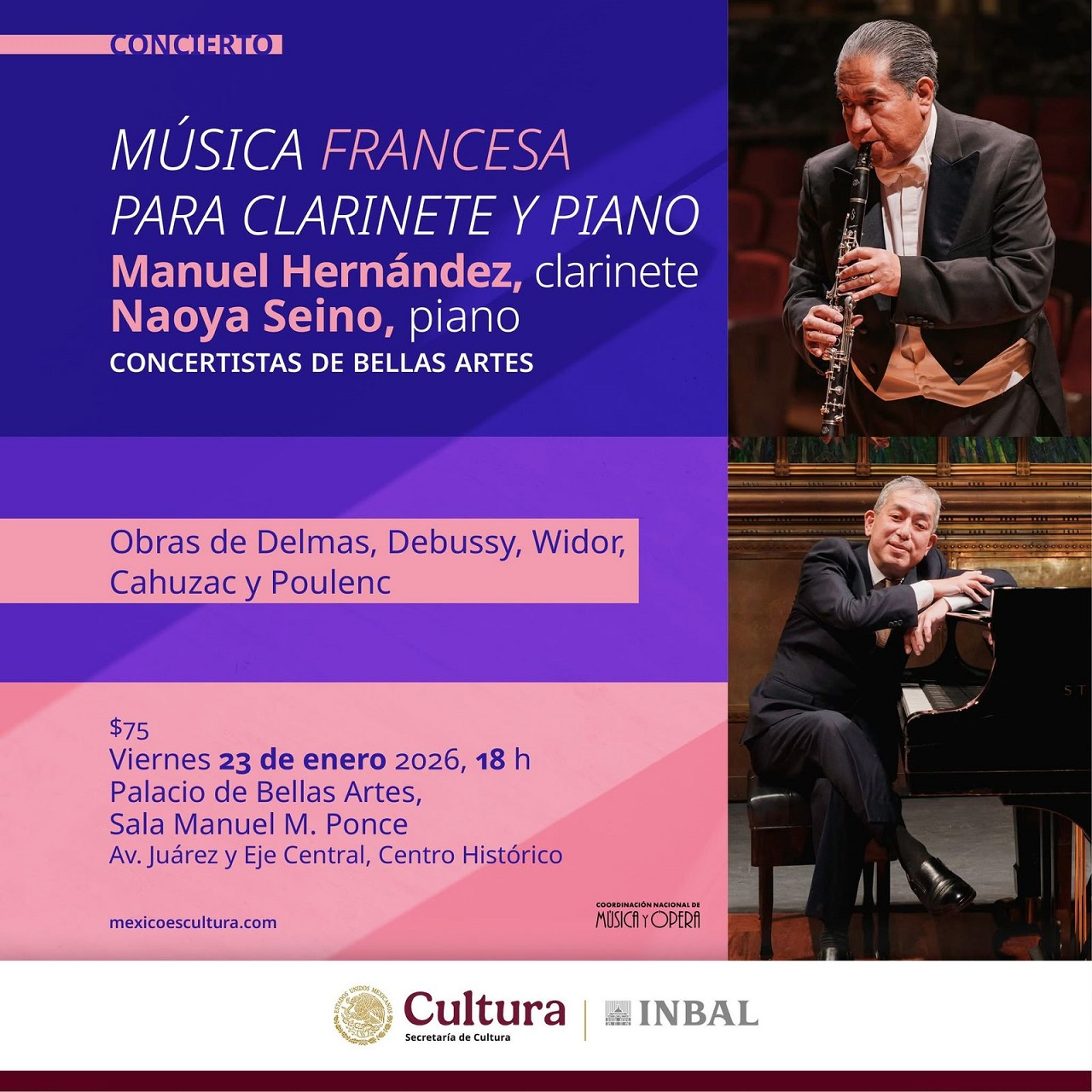 Con un repertorio que permitirá a las y los escuchas adentrarse en el lirismo de la música francesa de los siglos XIX y XX, el clarinetista Manuel Hernández y el pianista Naoya Seino presentarán un concierto el viernes 23 de enero, a las 18 horas, en la Sala Manuel M. Ponce del Palacio de Bellas Artes.