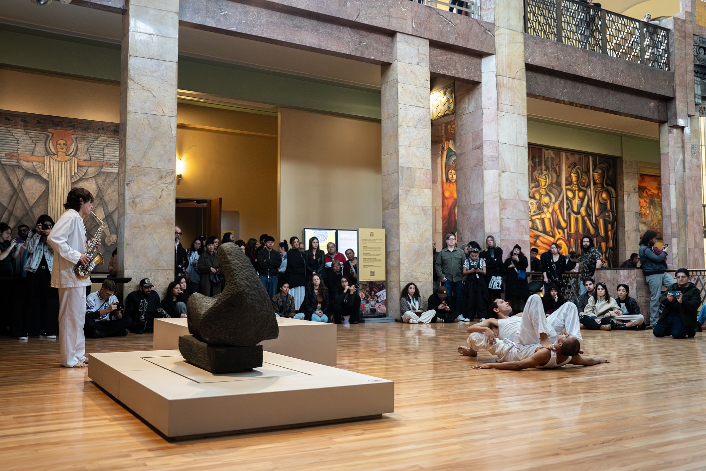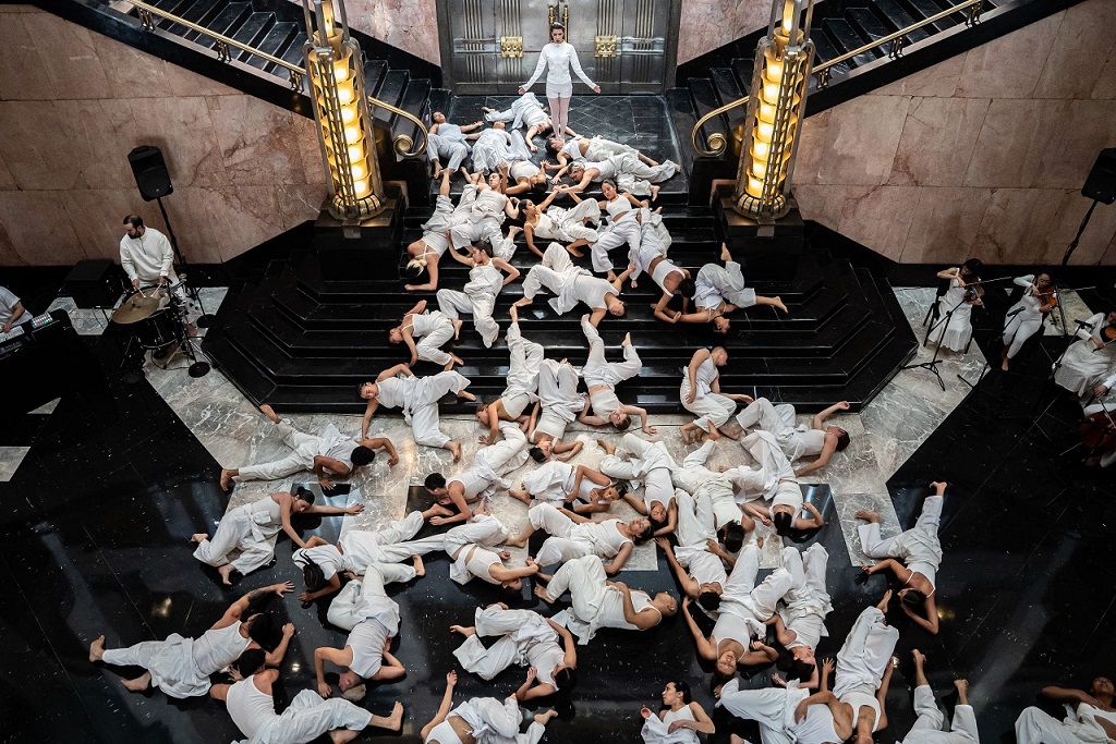 AsÃ, las bailarinas y bailarines vestidos de blanco recorren el vestÃbulo del Palacio de Bellas Artes, sus pasillos, las escaleras, la Sala Internacional y el área de murales en diálogo con los espacios y la memoria plagada en sus pilares, pisos, puertas y luces, en la obra de David Alfaro Siqueiros, Rufino Tamayo, Jorge González Camarena, Geles Cabrera, y, por supuesto con el público, que ya sea en el vestÃbulo o en el segundo piso, se convierte en otro elemento en movimiento que forma parte de la vida del Palacio y que en plena libertad, al igual que los artistas, puede ir de un espacio a otro, en busca de la mejor vista de la presentación.