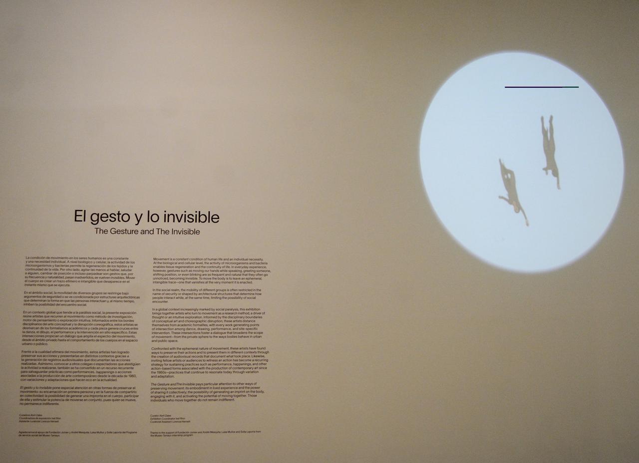 En la exposición El gesto de lo invisible se presenta obra de trece artistas contemporáneos: Anthony McCall (Reino Unido), Brendan Fernandes (Canadá), Bruce Nauman (Estados Unidos), Calixto Ramírez (México), Cally Spooner (Reino Unido), Julio LeParc (Argentina), Mayra Silva (México), Marcelo Brodsky (Argentina), Renée Rhodes (Estados Unidos), Rita Ponce de León (Perú), Samara Colina (México), Trisha Brown (Estados Unidos) y William Forysthe (Estados Unidos).