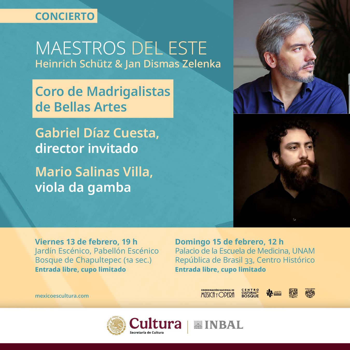 • Bajo la dirección del maestro invitado Gabriel Díaz Cuesta, presentarán el programa Maestros del Este: Heinrich Schütz & Jan Dismas Zelenka, con la participación de Mario Salinas Villa en la viola da gamba