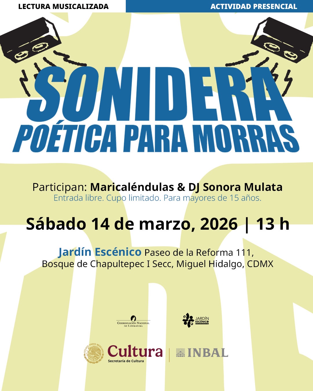 El Instituto Nacional de Bellas Artes y Literatura (INBAL), a través de la Coordinación Nacional de Literatura, presentará Sonidera Poética para Morras, una lectura musicalizada que busca abrir un espacio de encuentro, voz y ritmo donde la palabra se vuelva colectiva. La actividad se realizará el sábado 14 de marzo a las 13 horas en el Jardín Escénico del Centro Cultural del Bosque.