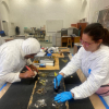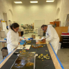 La intervención se realizó de manera puntual en las áreas afectadas del conjunto mural, en particular en algunos cráneos y en el panel alusivo al “Tzompantli”, realizado con la técnica de vidrio fusionado y termoformado.