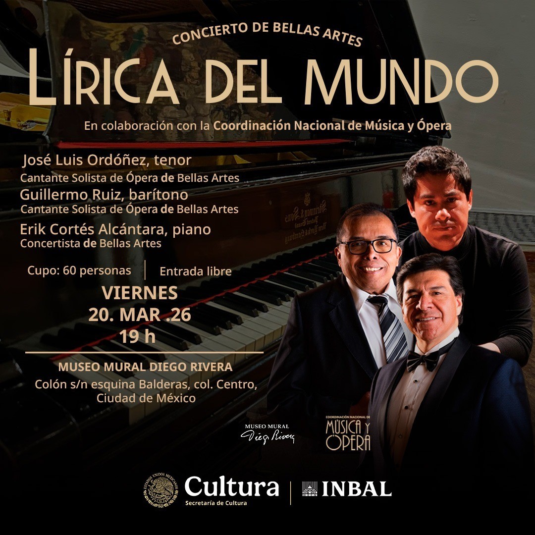 La Coordinación Nacional de Música y Ópera del Instituto Nacional de Bellas Artes y Literatura (INBAL) presentará el concierto Lírica del mundo en el Museo Mural Diego Rivera, con un programa que integra arias de ópera y música de cámara para voz y piano.