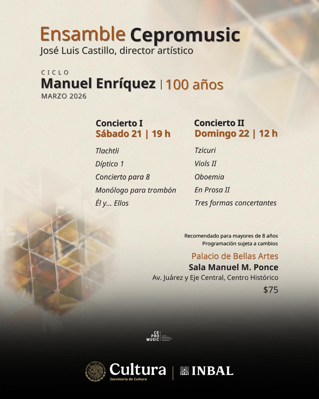 En el marco de las celebraciones por el 80 aniversario del Instituto Nacional de Bellas Artes y Literatura (INBAL) y el 100 aniversario del nacimiento del compositor mexicano Manuel Enríquez, el Centro de Experimentación y Producción de Música Contemporánea (CEPROMUSIC) convoca al ciclo “Manuel Enríquez | 100 años”.
