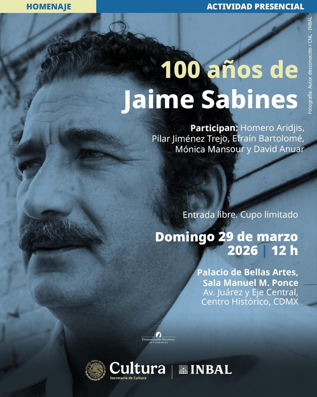 La Secretaría de Cultura del Gobierno de México y el Instituto Nacional de Bellas Artes y Literatura (INBAL), a través de la Coordinación Nacional de Literatura (CNL) y la Coordinación Nacional de Artes Visuales (CNAV), rendirán homenaje al poeta Jaime Sabines con motivo de los cien años de su nacimiento.