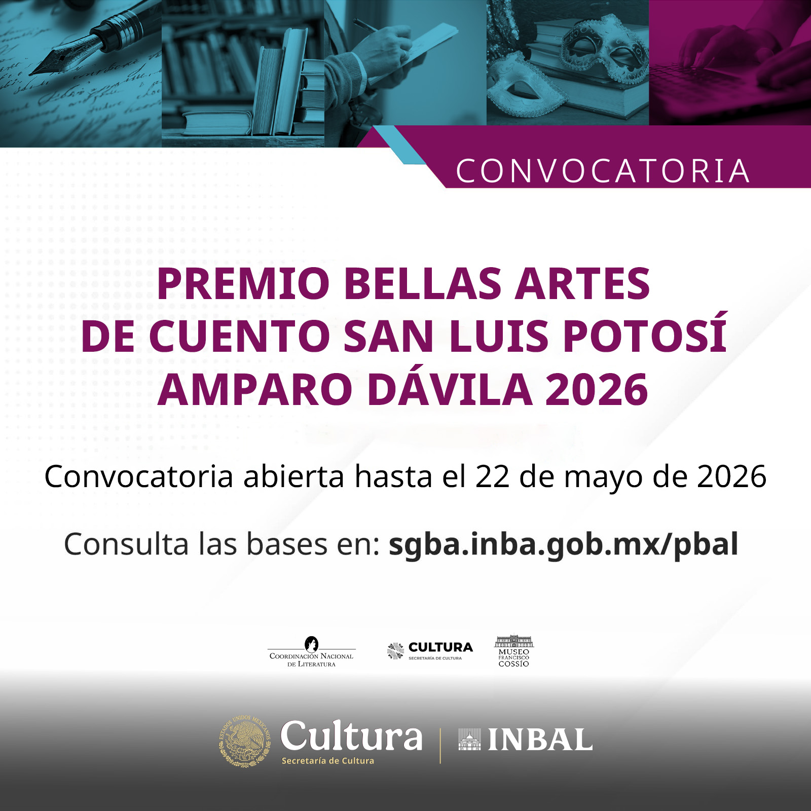 La Secretaría de Cultura del Gobierno de México y el Instituto Nacional de Bellas Artes y Literatura (INBAL), a través de la Coordinación Nacional de Literatura, en colaboración con el Gobierno del Estado de San Luis Potosí, convocan al Premio Bellas Artes de Cuento Amparo Dávila 2026.