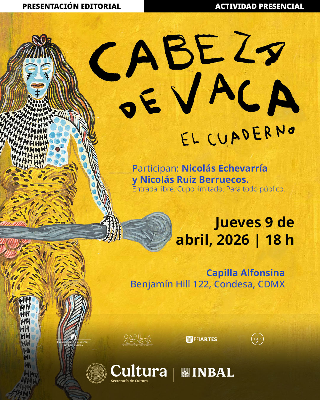 La Secretaría de Cultura del Gobierno de México y el Instituto Nacional de Bellas Artes y Literatura (INBAL), a través de la Coordinación Nacional de Literatura (CNL), presentarán el libro Cabeza de Vaca. El cuaderno, de Nicolás Echevarría y Nicolás Ruiz Berruecos.