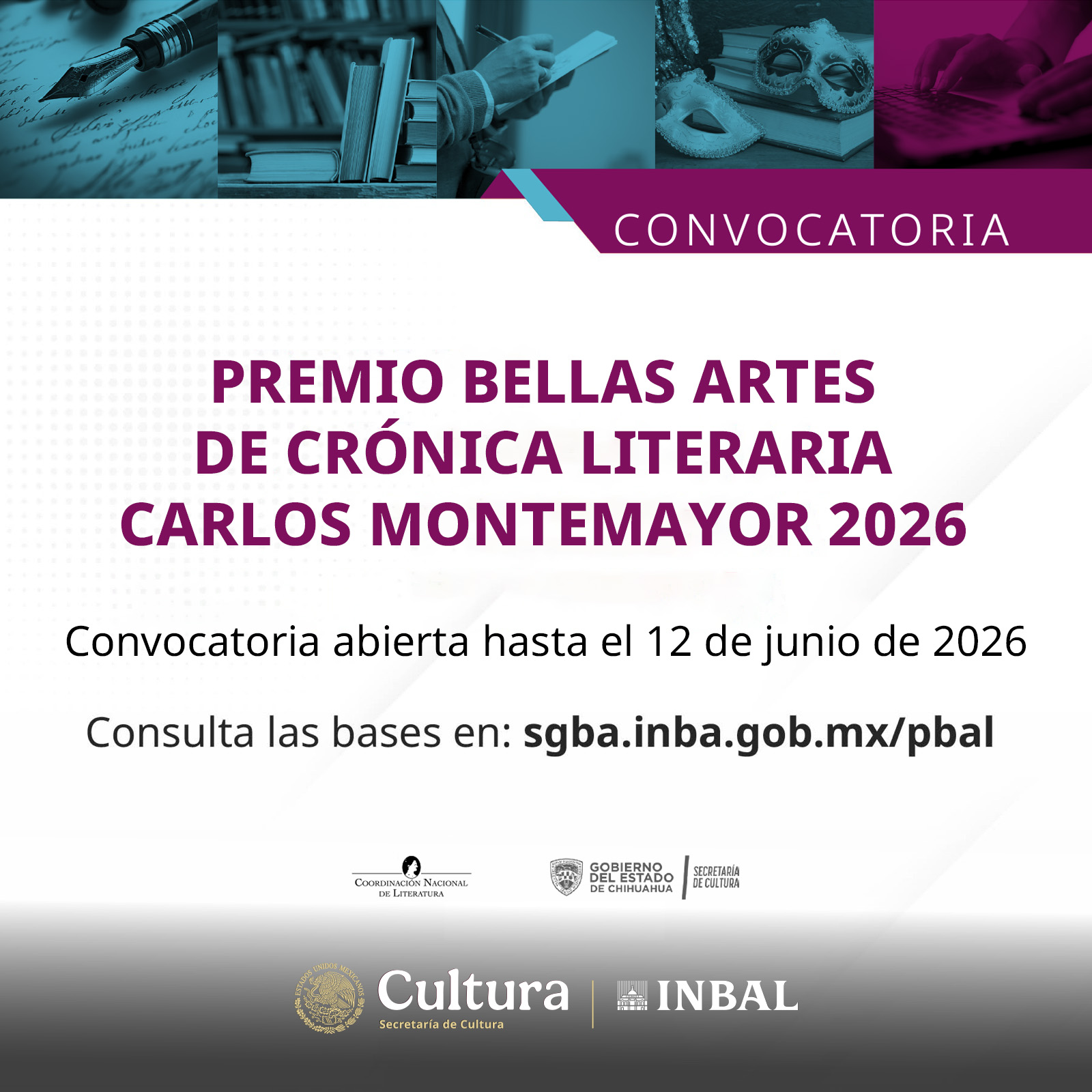 La Secretaría de Cultura del Gobierno de México y el Instituto Nacional de Bellas Artes y Literatura (INBAL), a través de la Coordinación Nacional de Literatura, en colaboración con el Gobierno del Estado de Chihuahua, a través de su Secretaría de Cultura, convocan al Premio Bellas Artes de Crónica Literaria Carlos Montemayor 2026.