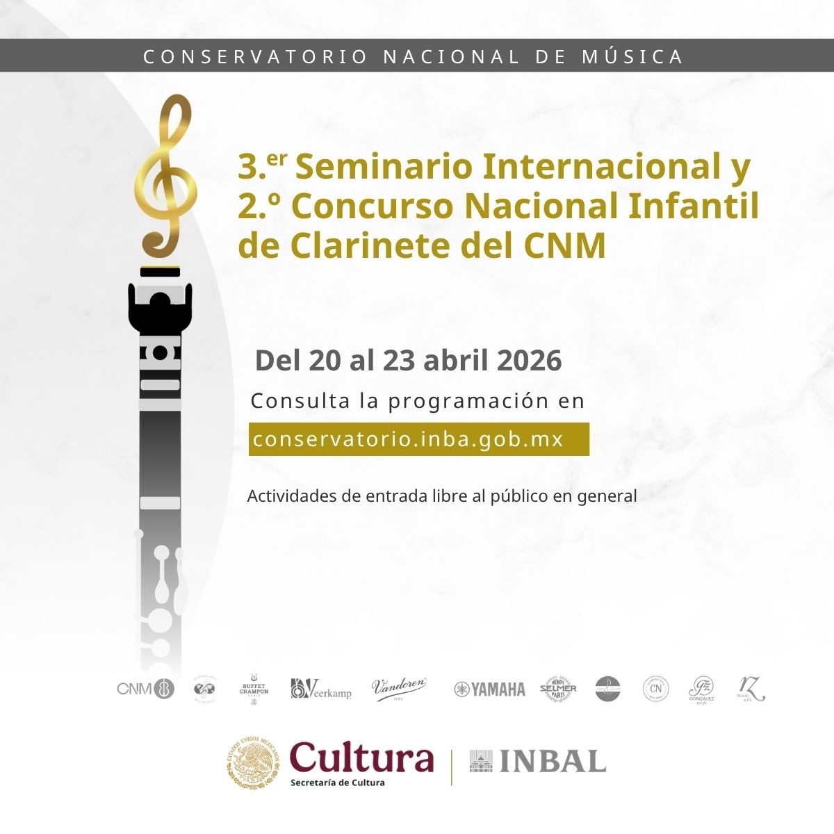 El Conservatorio Nacional de Música (CNM), de la Subdirección General de Educación e Investigación Artísticas (SGEIA) del Instituto Nacional de Bellas Artes y Literatura (INBAL), invita a las actividades del Tercer Seminario Internacional y Segundo Concurso Nacional Infantil de Clarinete del CNM, que se realizarán del 20 al 23 de abril en sus instalaciones.
