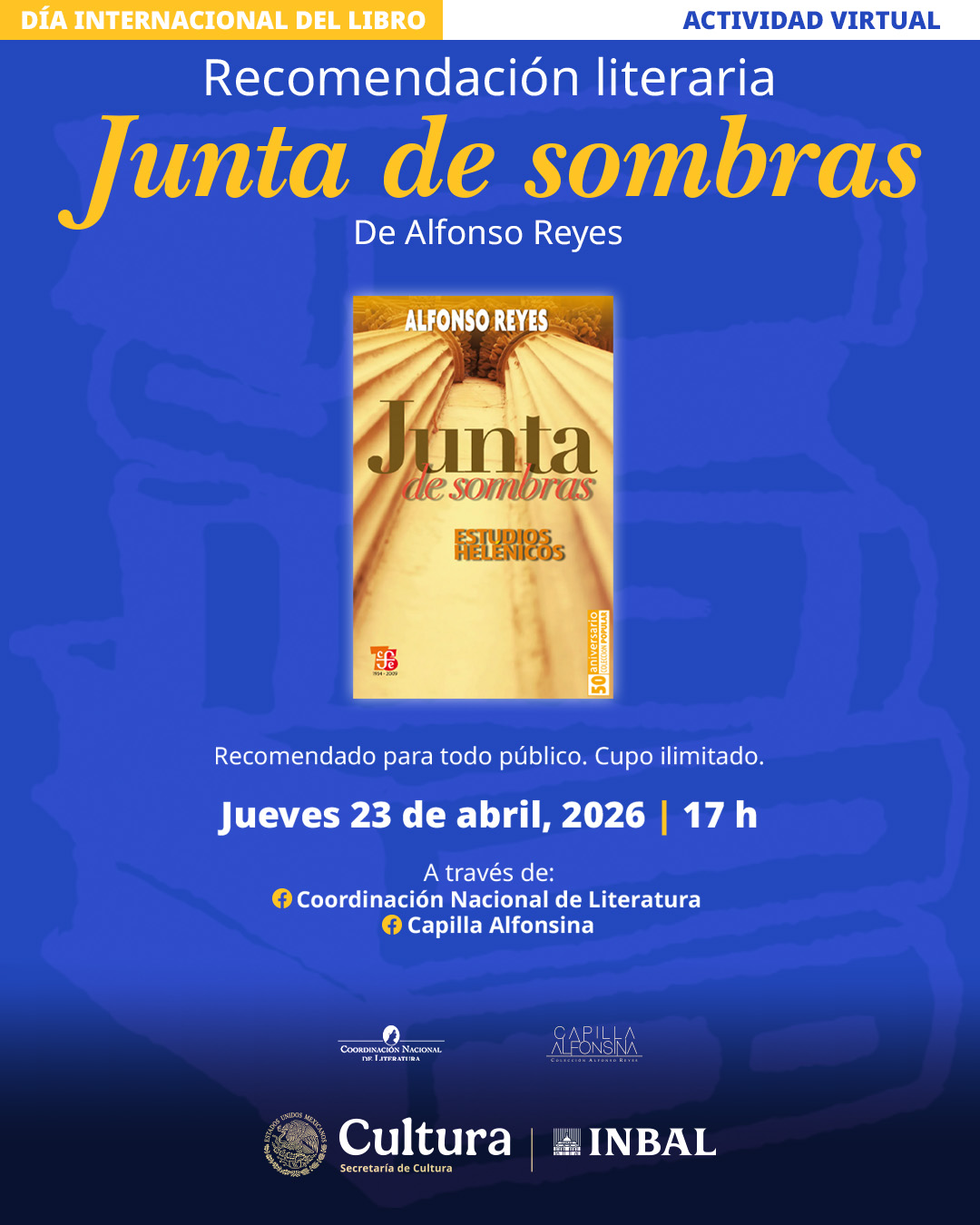 La Coordinación Nacional de Literatura (CNL) y la Capilla Alfonsina ofrecerán una charla virtual sobre el libro Junta de sombras, de Alfonso Reyes, a cargo de Javier Garciadiego. La obra reúne 28 ensayos sobre temas helénicos. La charla se llevará a cabo el 23 de abril, a las 17 horas, a través del Facebook de la CNL y de la Capilla Alfonsina.