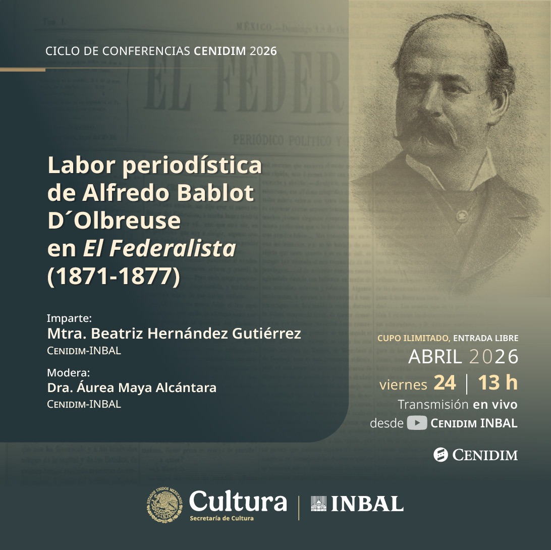 Este evento, que forma parte del Ciclo de conferencias CENIDIM 2026, brindará un acercamiento a la labor periodística de Alfredo Bablot, uno de los cronistas musicales más destacados del periodo. La charla tomará como punto de partida algunos de los escritos de Bablot en el periódico El Federalista; estos permitirán conocer prácticas, preferencias y personajes relevantes del México decimonónico.