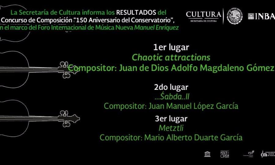 El ganador del Concurso de Composición 150 aniversario del Conservatorio, Juan de Dios Adolfo Magdaleno Gómez, se hizo acreedor al premio dotado de 100 mil pesos, mientras que el segundo sitio, Juan Manuel López García, obtiene así un estímulo de 30 mil pesos. Mario Alberto Duarte García, ganador del tercer lugar, recibirá 20 mil pesos.