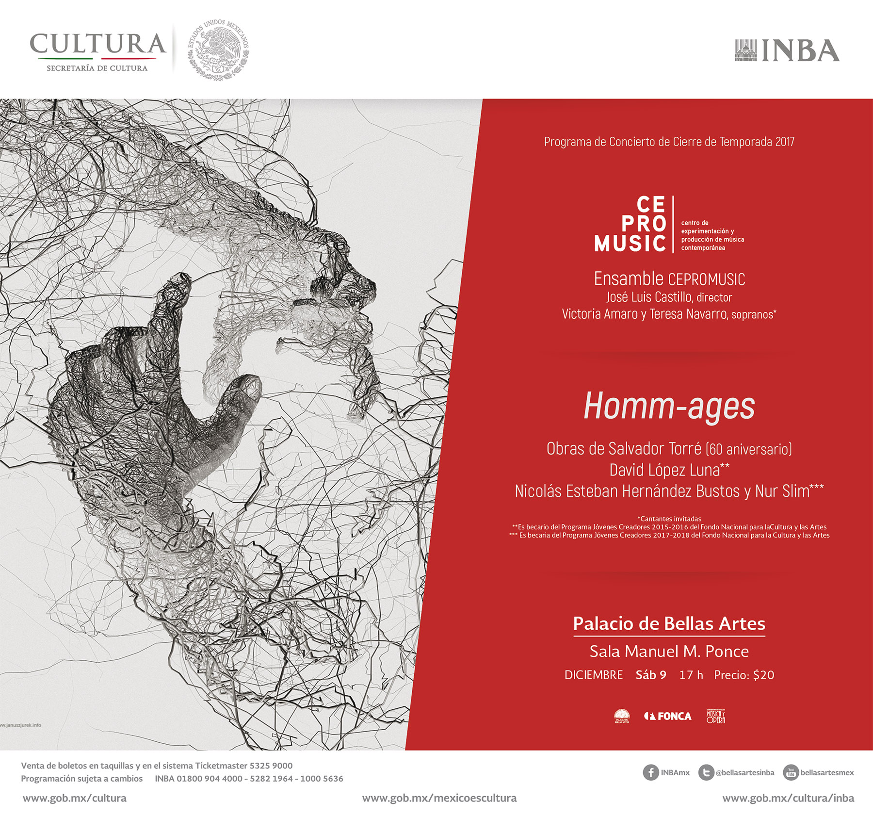 En esta presentación, la agrupación dependiente del Instituto Nacional de Bellas Artes (INBA) hará un homenaje a Salvador Torré, por sus 60 años de vida. Interpretará dos de sus obras: Homm-ages y Abbau-trace, que abren y cierran el programa, respectivamente.
