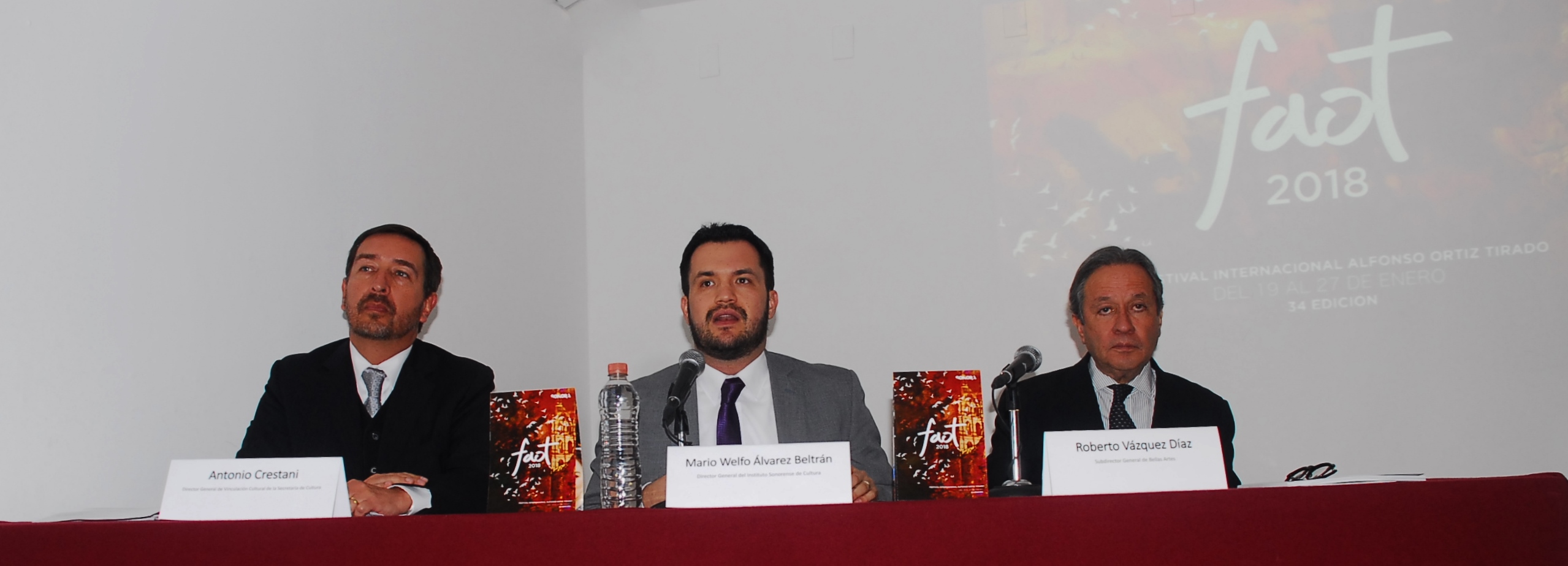 En representación de la directora general del Instituto Nacional de Bellas Artes, Lidia Camacho, el subdirector general de Bellas Artes, Roberto Vázquez, en compañía de Antonio Crestani, director general de Vinculación Cultural de la Secretaría de Cultura y Mario Welfo Álvarez Beltrán, director general del Instituto Sonorense de Cultura, dio a conocer ayer, en la Sala Adamo Boari del Palacio de Bellas Artes, la programación de dicho encuentro.