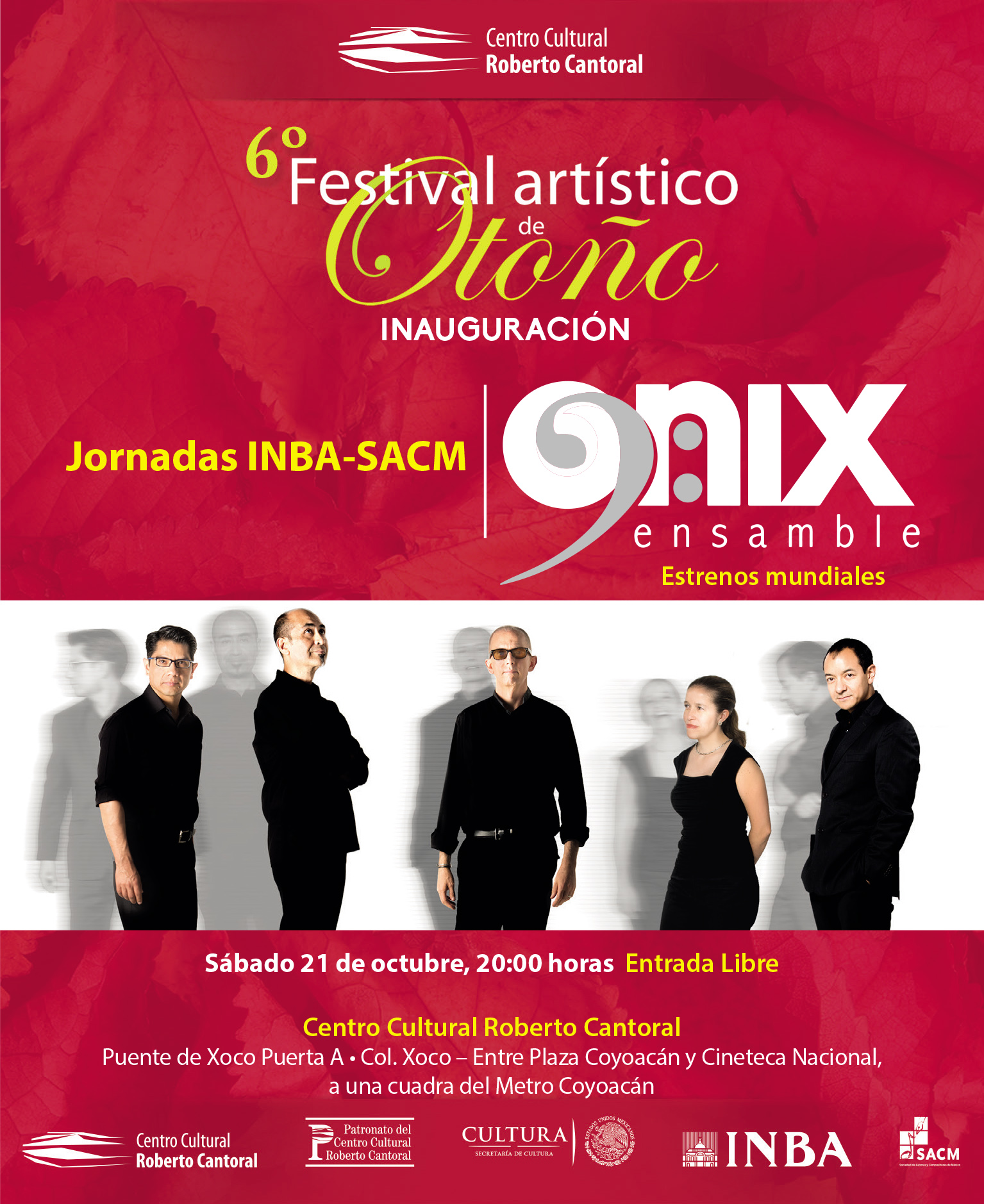 El 6° Festival Artístico de Otoño, organizado por el Patronato del CCRC y la Secretaría de Cultura a través del INBA, ofrece una gama amplia de conciertos con diversos géneros y ritmos con el propósito de mantener el estímulo en la producción y difusión del arte de la composición.